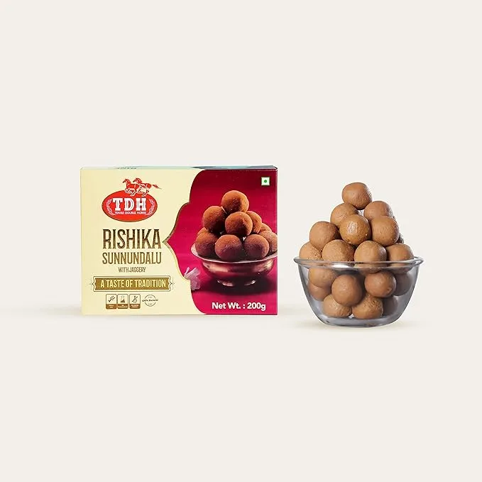 Sunnundalu - TDH Rishika - 200 grams Savor the authentic flavor of Tenali Double Horse Rishika Sunnundalu (200 Grams) — traditional crispy sweet lentil snacks crafted from roasted urad dal, jaggery, and aromatic spices. These sunnundalu are a popular festive delicacy in South India, perfect for celebrations or as a delightful everyday snack.