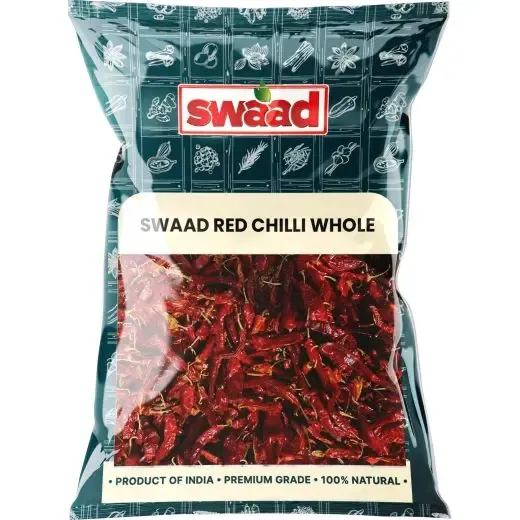 Swaad Red Chilli Whole in the 300g pack is a common pantry staple for authentic Indian cooking, known for providing both significant heat and a rich red color to dishes.