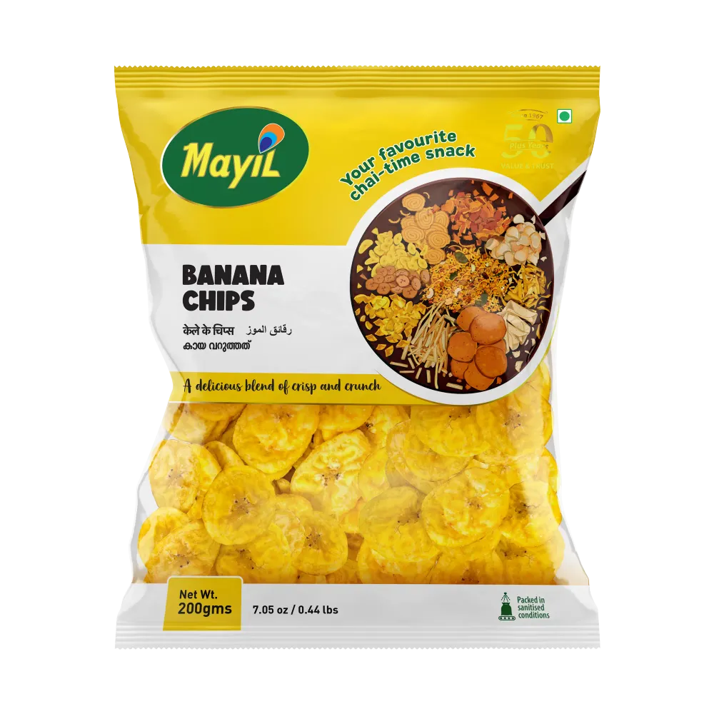 Mayil banana chips are authentic Kerala-style snacks made from thinly sliced bananas, traditionally deep-fried in coconut oil or vegetable oil to achieve a signature golden crunch. They are available in several varieties, including ripe (sweet), spicy, and peri peri flavours.
